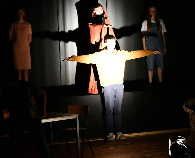 Een bevreemdend verhaal over pesten en stotteren, over buiksprekerspoppen in een donkere kelder, over de lugubere Russische Raspoetin, over poppen die spreken, over een jongen die spreekt als een pop… Een verhaal vol spanning, vol humor en met enkele donkere kantjes. Een verhaal dat gebracht wordt door een zeer uitgebreide cast. Met een aantal enthousiaste jongeren maar ook met ervaren rotten met het hart van een puber. Een must voor al wie van toneel houdt dat boeit maar net een tikkeltje anders is.